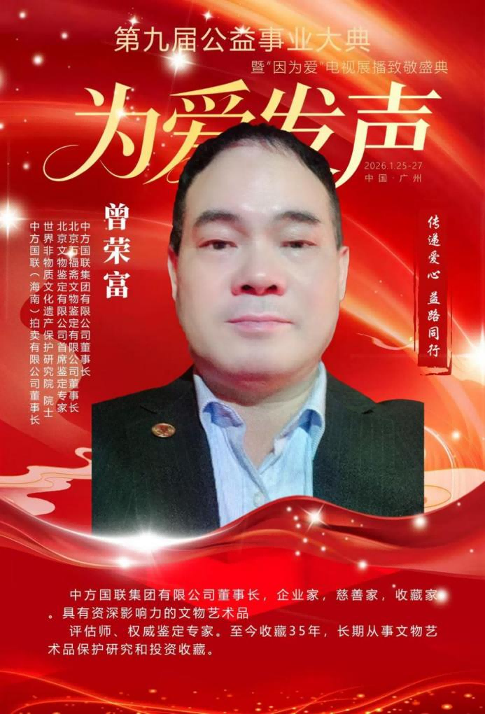 在第九届公益事业大典隆重举行的荣耀之夜,北京万福斋文物鉴定有限公司董事长曾荣富被授予“2025年度公益先锋人物”荣誉称号。