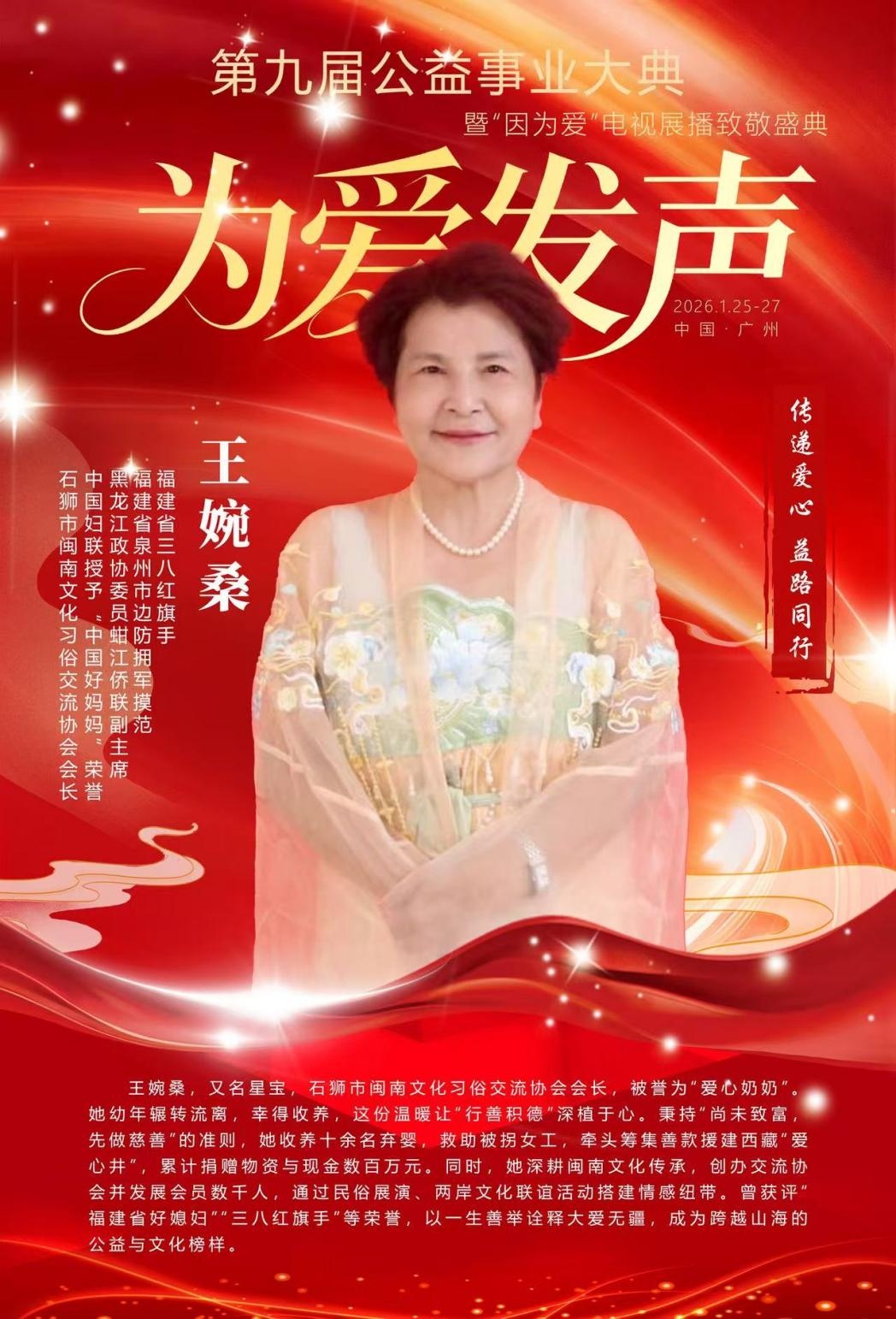从磨难中崛起,于善举中沉淀,在传承中发光。王婉桑用一生践行“爱心传递,大爱无疆 ”的承诺,如闽南暖阳映照日月,以善心滋养桑梓,让爱心与文化代代相传,凝聚起跨越山海的向善力量,照亮更多人前行的道路。