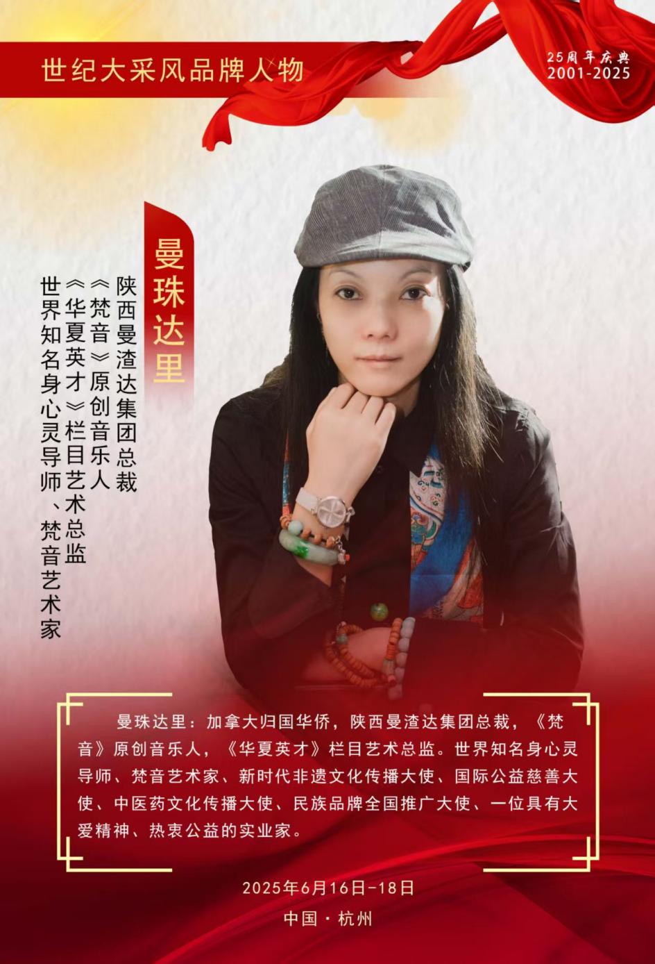 著名表演艺术家《梵音》原创音乐人曼珠达里女士接受中央广播电视总台中央新影《华夏英才》栏目的采访,西安曼渣达创意文化传播有限公司董事长,是一位杰出的梵音艺术家、《华夏英才》栏目的艺术总监、世界知名身心灵导师、高级心理咨询师、“药膳”专利发明人、文化企业家与创新实践者。作为著名音乐表演艺术家、《梵音》原创音乐人及《华夏英才》栏目艺术总监,被邀请参加群星春晚主持人并登台表演,入编《楷模的力量•时代奋斗者》大型纪实丛书。